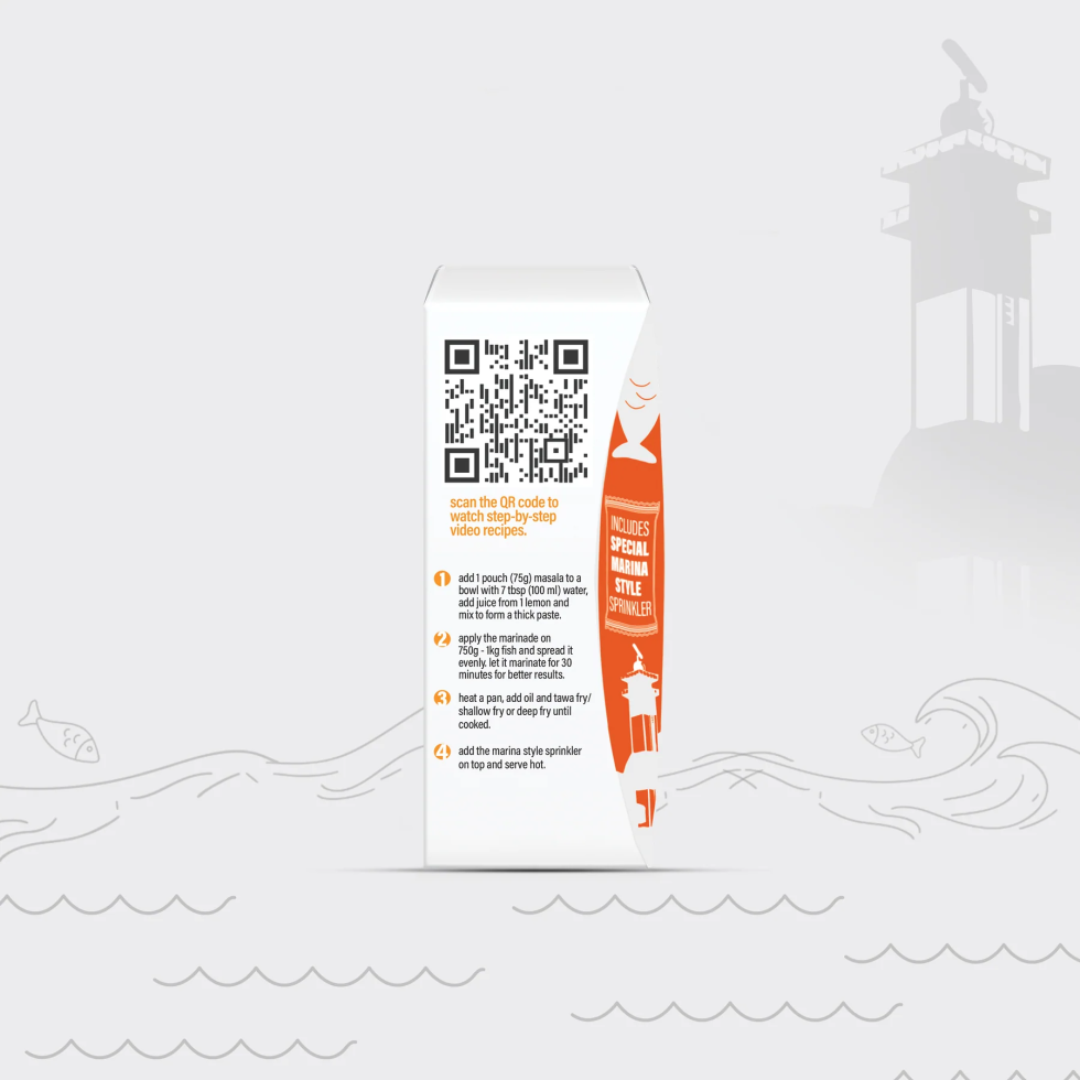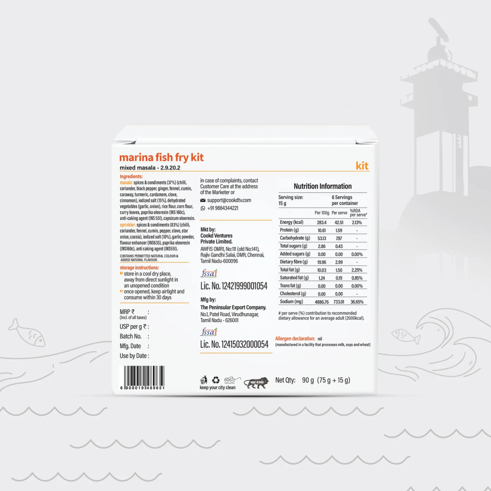 Contents of the pack: 1 pouch fish fry masala, 1 pouch special marina style sprinkler
